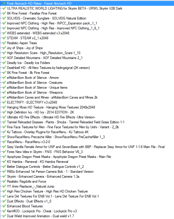 Modliste: Einige installierte Mods wie URWL sind nicht aktiviert, da sie mit ENB nicht funktionieren oder nur zu Testzwecken installiert sind.