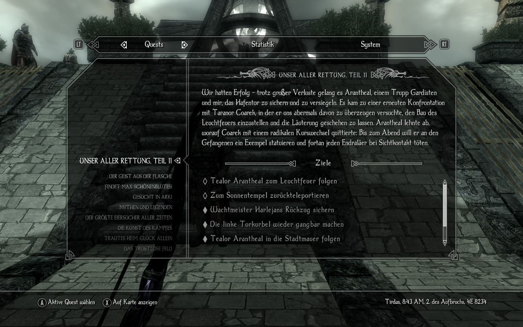 Hallo, Ich habe das Problem dass ich bei der Quest Unser aller Rettung Teil 2 nicht weiter komme. Da Talor Arantheal nicht reagiert ich kann ihn nur seine standard Dialoge zum Thema des Zkyklus aufrufen.