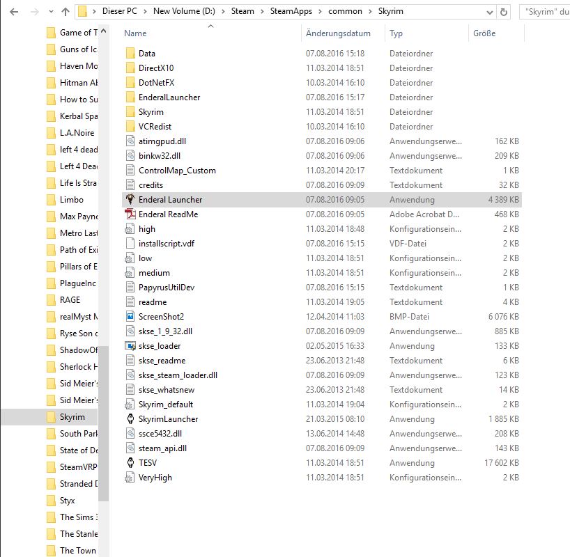Vielen Dank. Die Entfernung des Schreibschutzes auf dem Skyrim-Rootordner hat leider nicht gefruchtet (Edit: update-Ordner habe ich gelöscht und die updates wurden neu runtergeladen). Der Enderal-Launcher lag bei mir bereits im Skyrim-Rootordner (s. Screenshot).