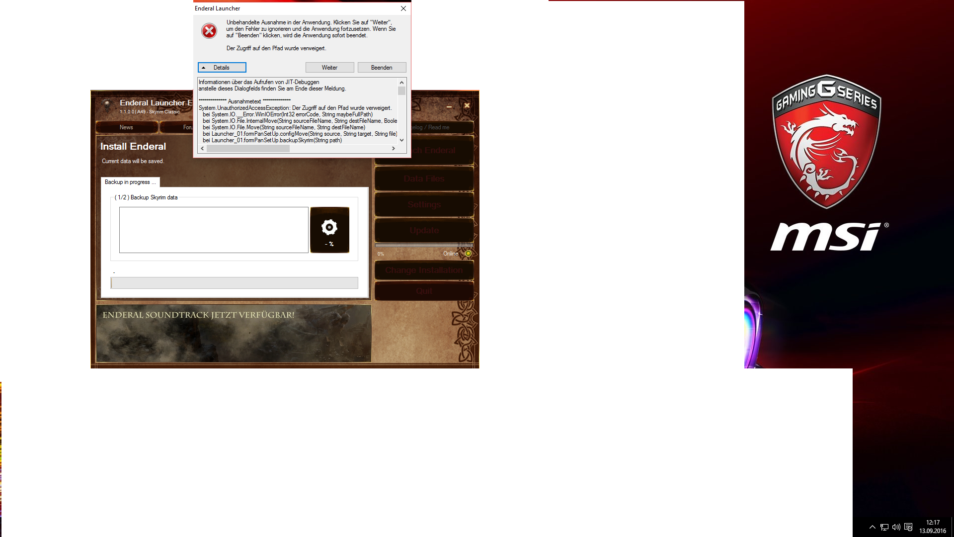 <14:21:45> Func - Remove write protection: C:\program files (x86)\steam\SteamApps\common\Skyrim\EnderalLauncher\system\ recursive