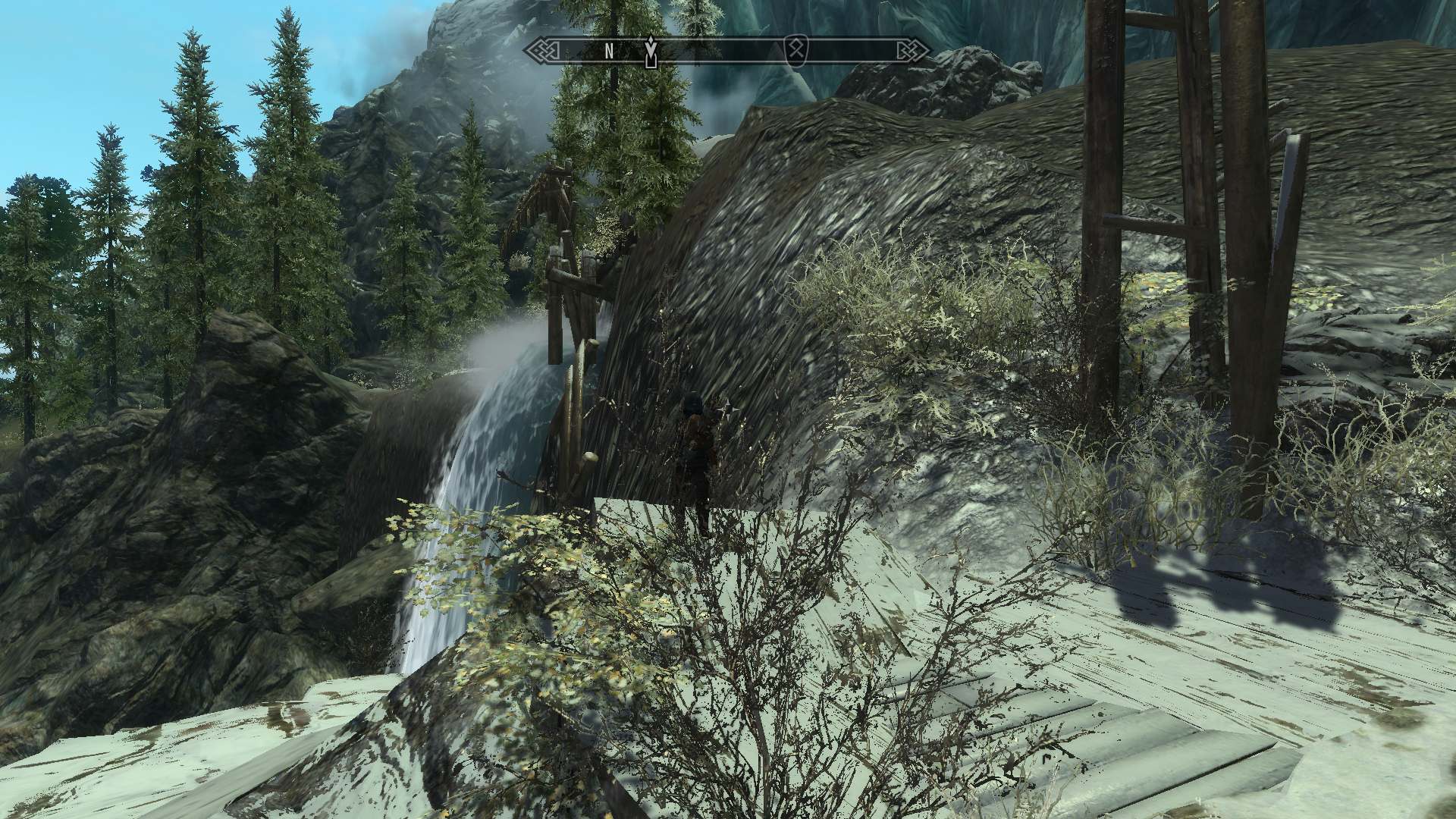 After playing a little more, I swung back around to this bridge, and it was gone again. For some reason it is not loading properly. Not just the bridge, there is a large section of the mountain, behind the bridge that is missing as well. But if I save the game at that location, exit Enderal, then restart the game the area looks fine.