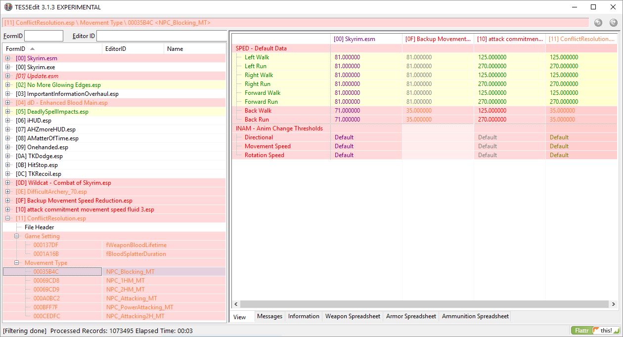 Leider schrauben die Mods #7 und #8 an identischen Werten. D.h. Je nachdem welche esp zuletzt im Enderal Starter geladen wird, ist die Rückwärtsbewegung oder die Angriffsdrehgeschwindigkeit präferiert. Daher empfehle ich "Attack Commitment" nach "Backup Movement Speed Reduction" zu laden, da NPC i.d.R. nicht allzu oft bis gar nicht rückwärts laufen oder fliehen, dafür umso öfter direkt angreifen. Wer dennoch beiden Mods in Symbiose frönt, kann sich meinen Screenshot im Anhang anschauen, um sich ein Bild davon zu machen wie viele Werte beeinflusst sind. Meiner Meinung nach ist dieser Edit aber nicht notwendig.