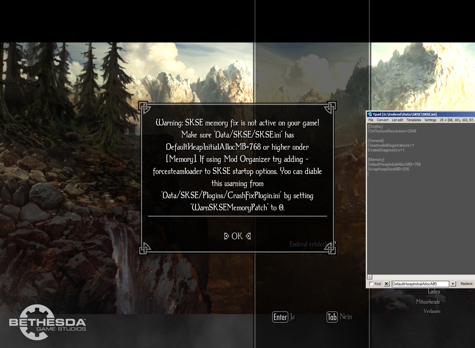 Warning: SKSE memory fix is not active on your game! Make sure 'Data/SKSE/SKSE.ini' has DefaultheapinitialallocMB=768 or higher under [Memory].