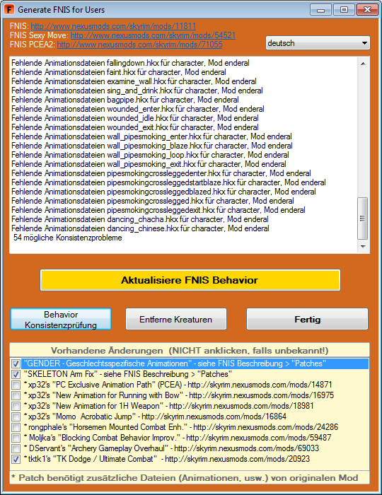 Nun läuft aber alles wieder stabil. Einzig eine Ungereimtheit, die ich mir nicht erklären kann: der Konsistenz-Test meldet 54 fehlende Animationen, die aber alle Enderal betreffen o.O